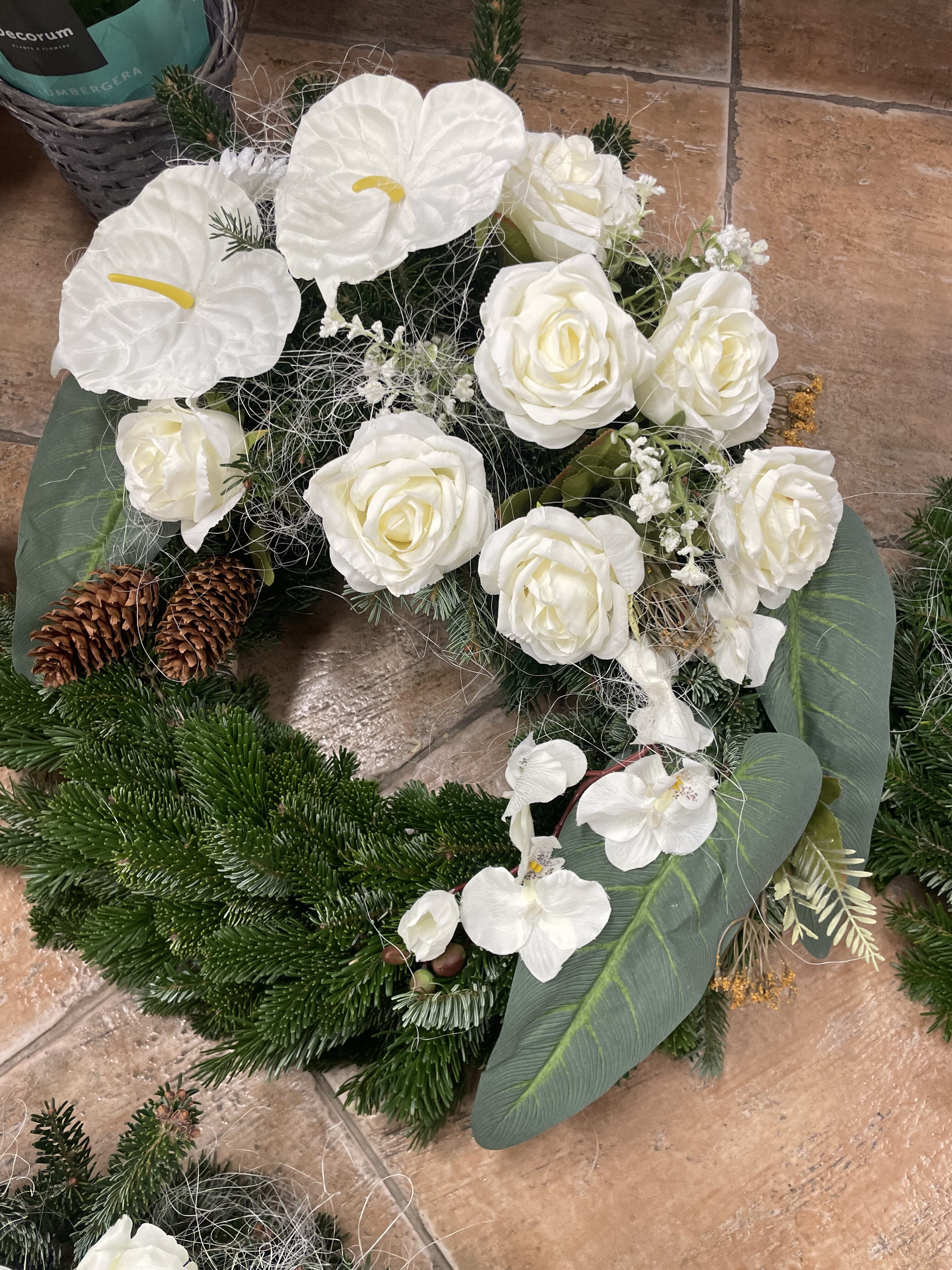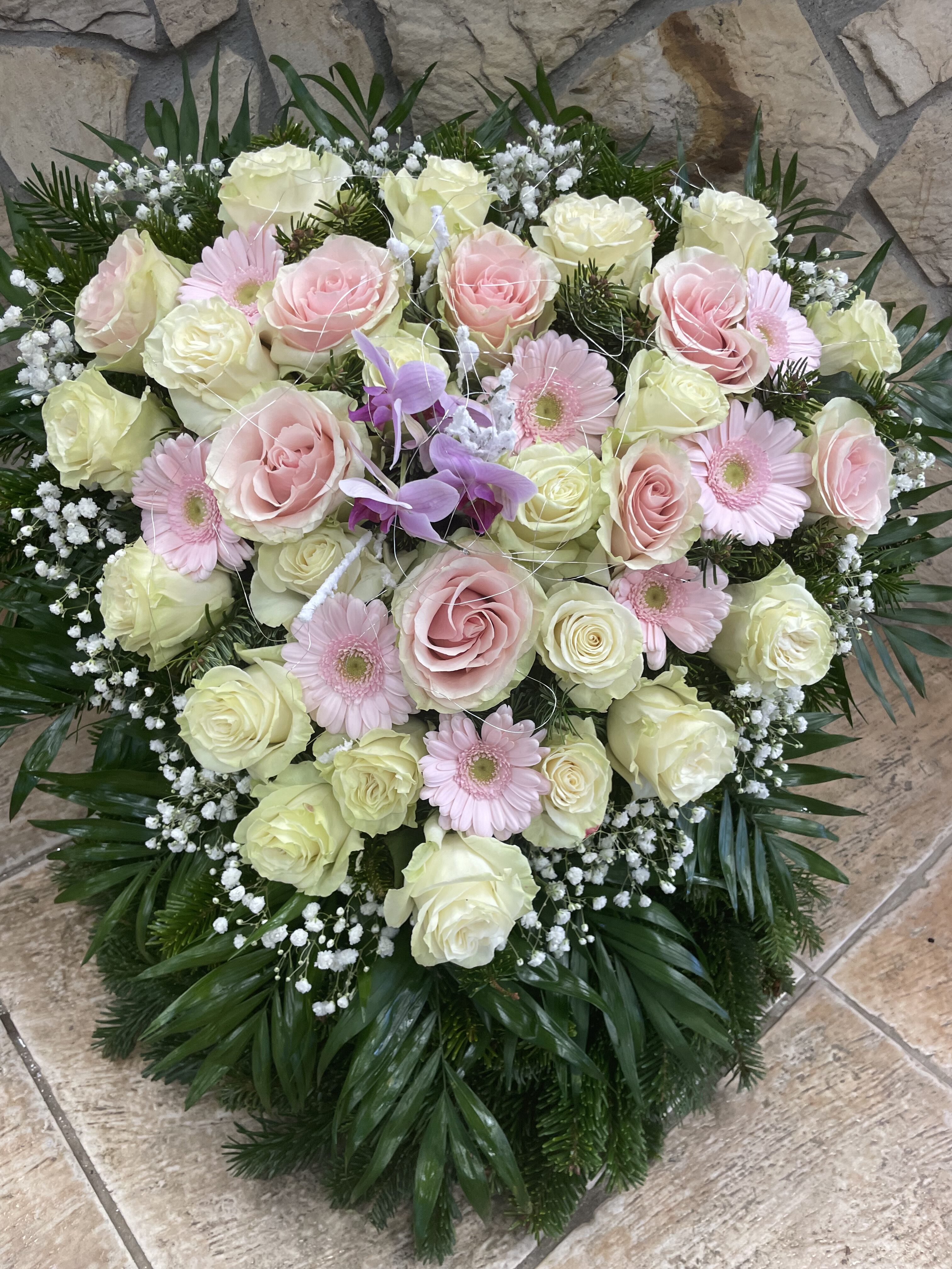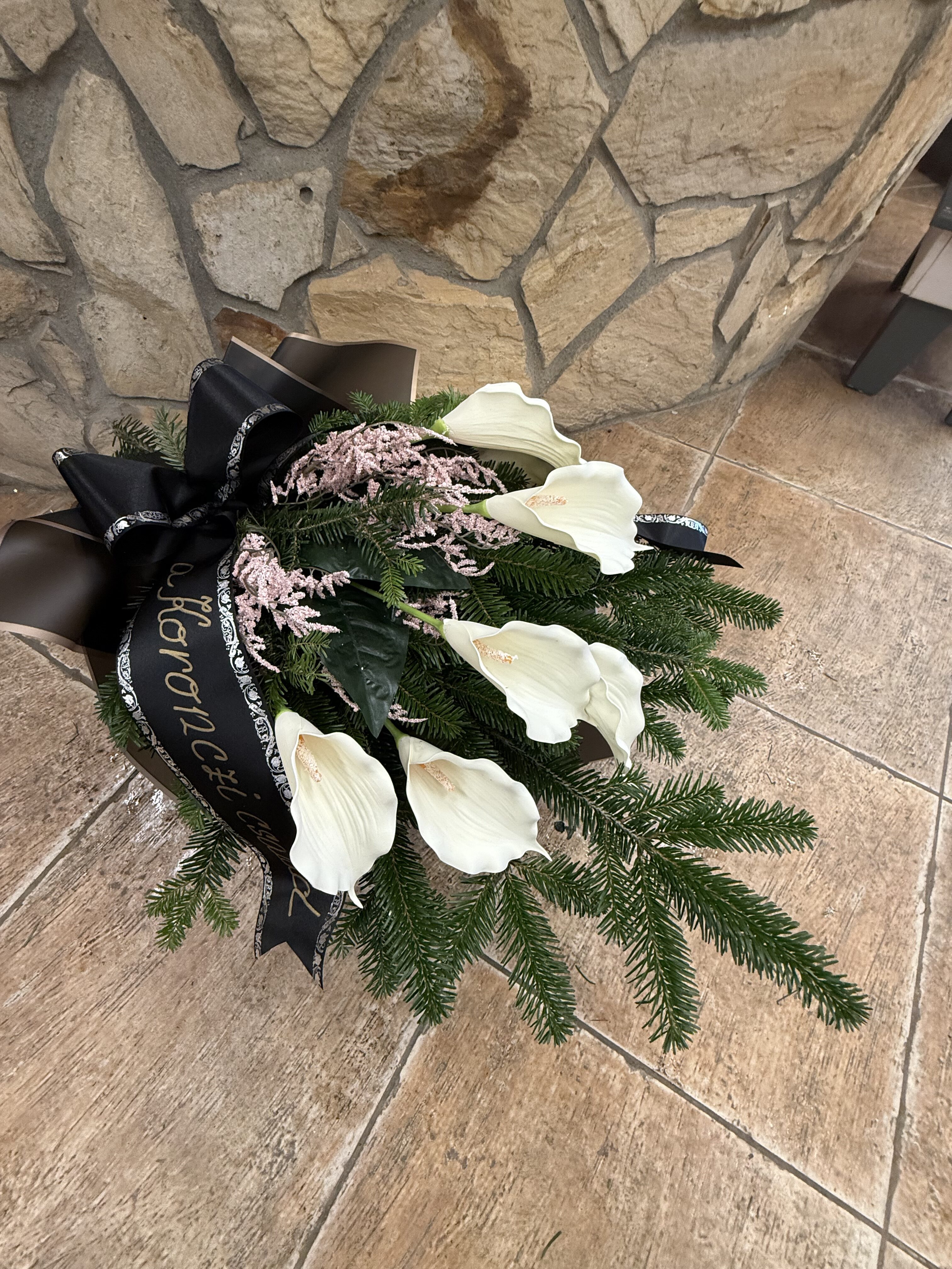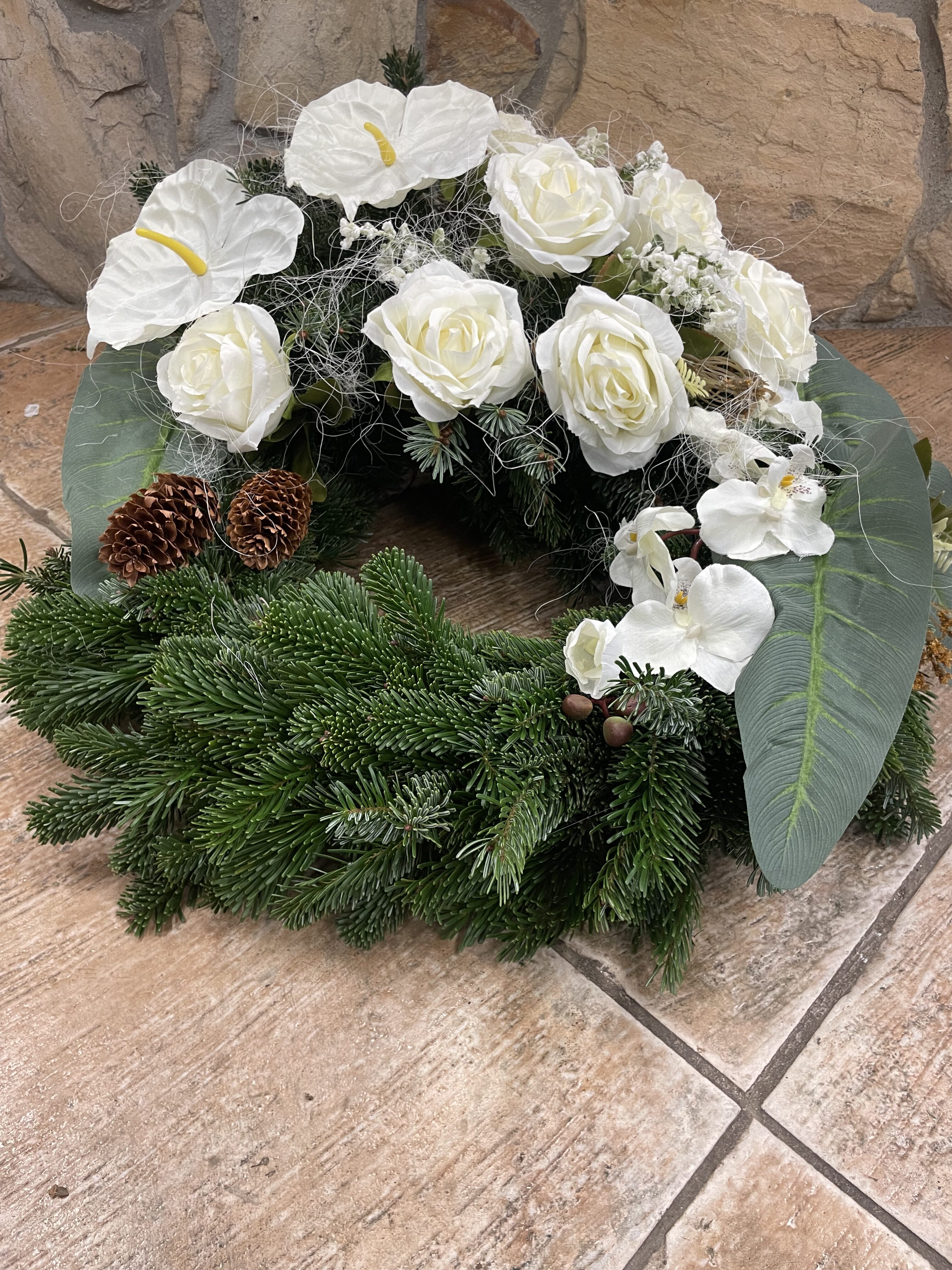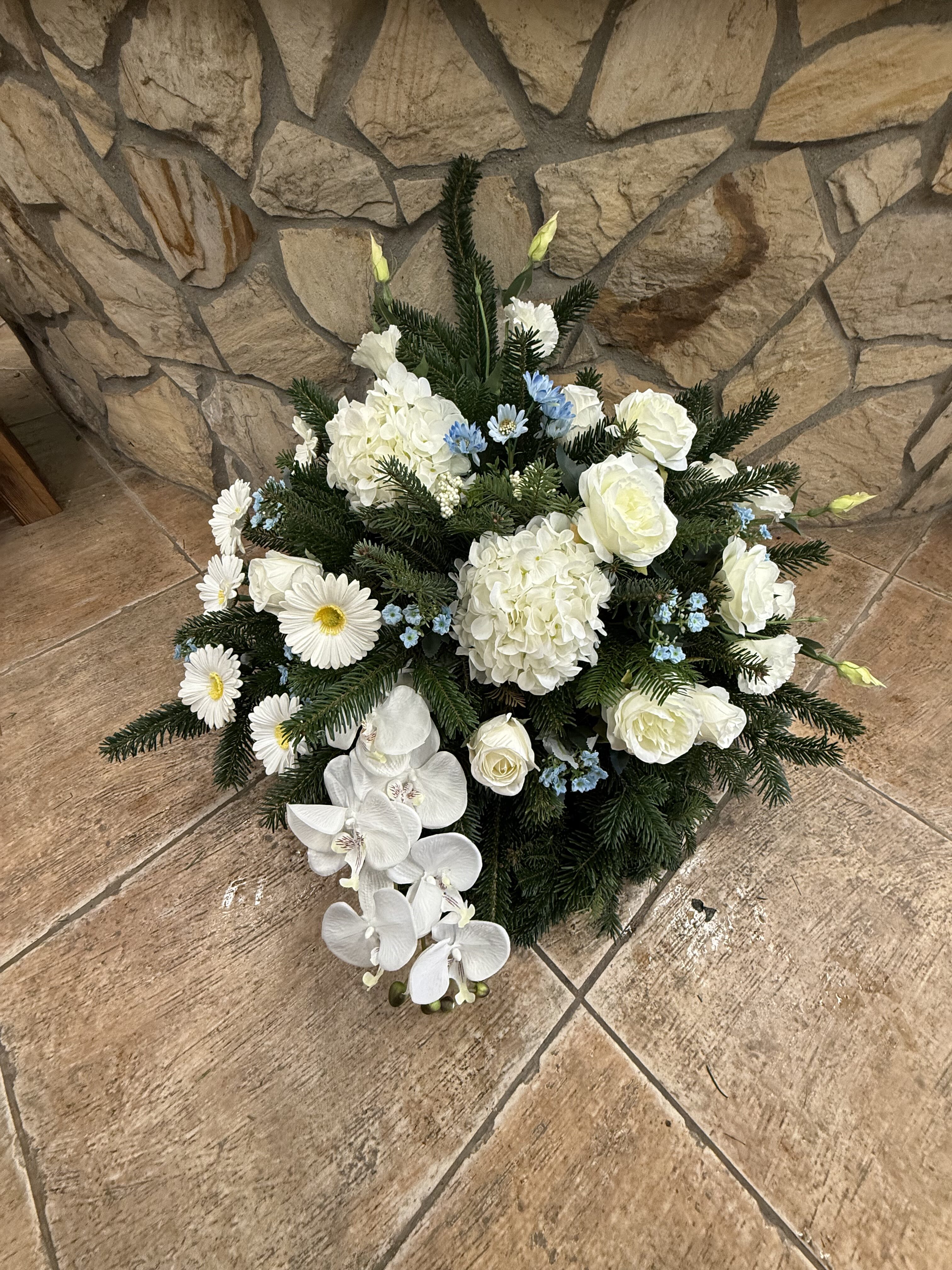 Naše vence sú starostlivo aranžované z čerstvých kvetov a zelene, aby vyjadrovali úprimnú sústrasť a dôstojnosť. Používame kvety s hlbokou symbolikou – biele ľalie na vyjadrenie pokoja a čistoty, ruže na znak lásky a úcty, chryzantémy na večnú spomienku. Každý veniec je navrhnutý s dôrazom na estetiku a pietu, aby dôstojne dopĺňal poslednú rozlúčku.