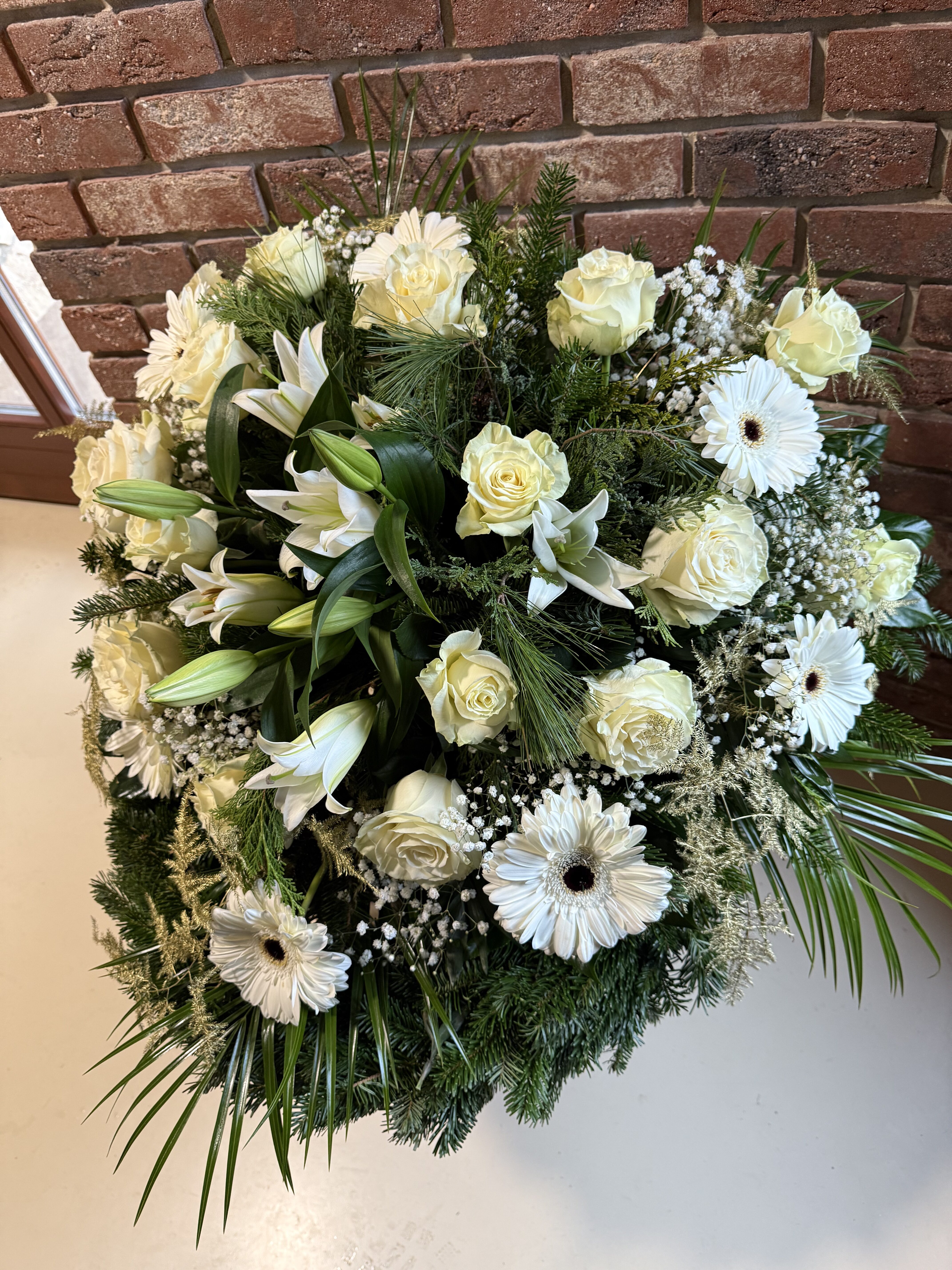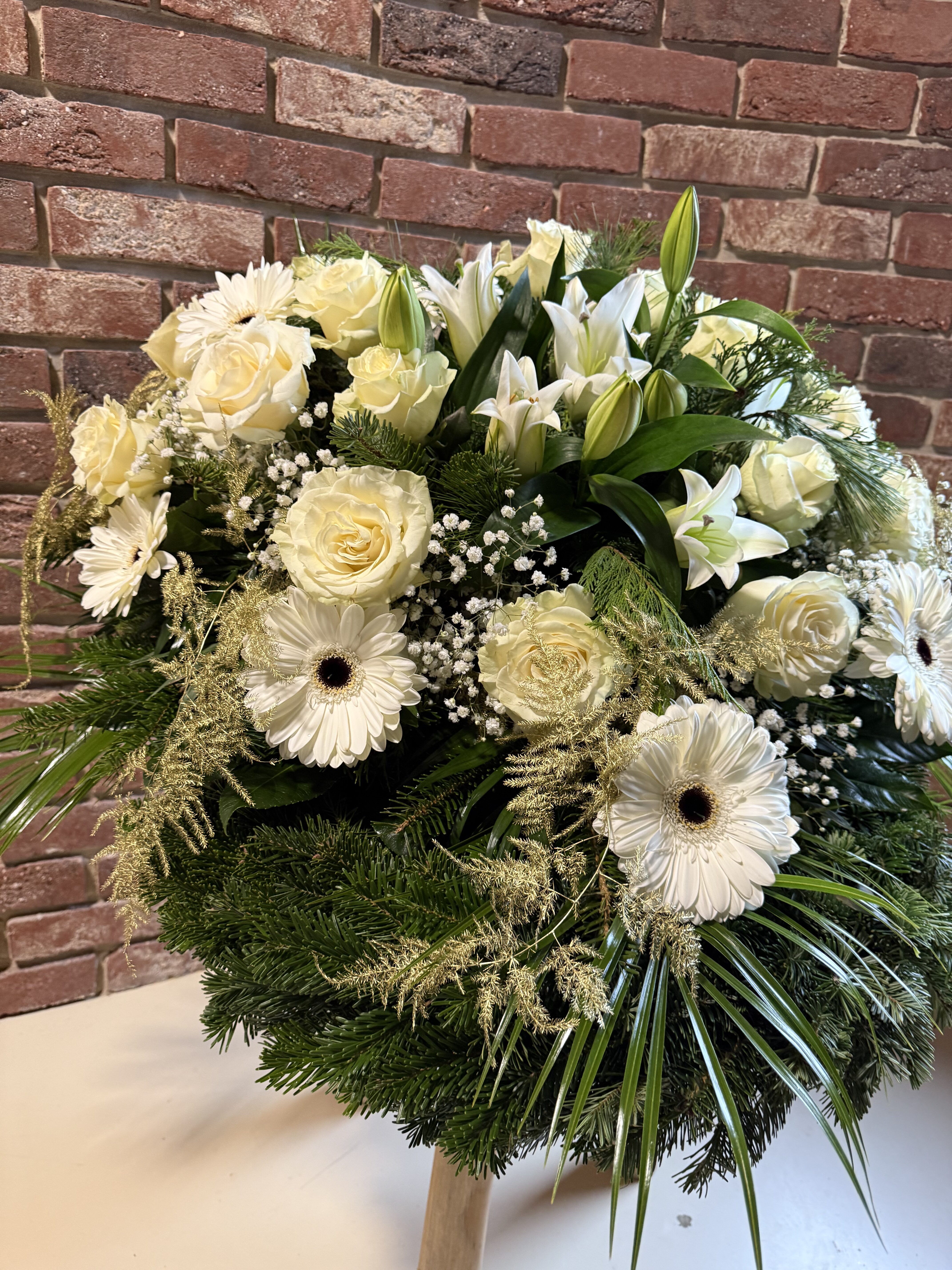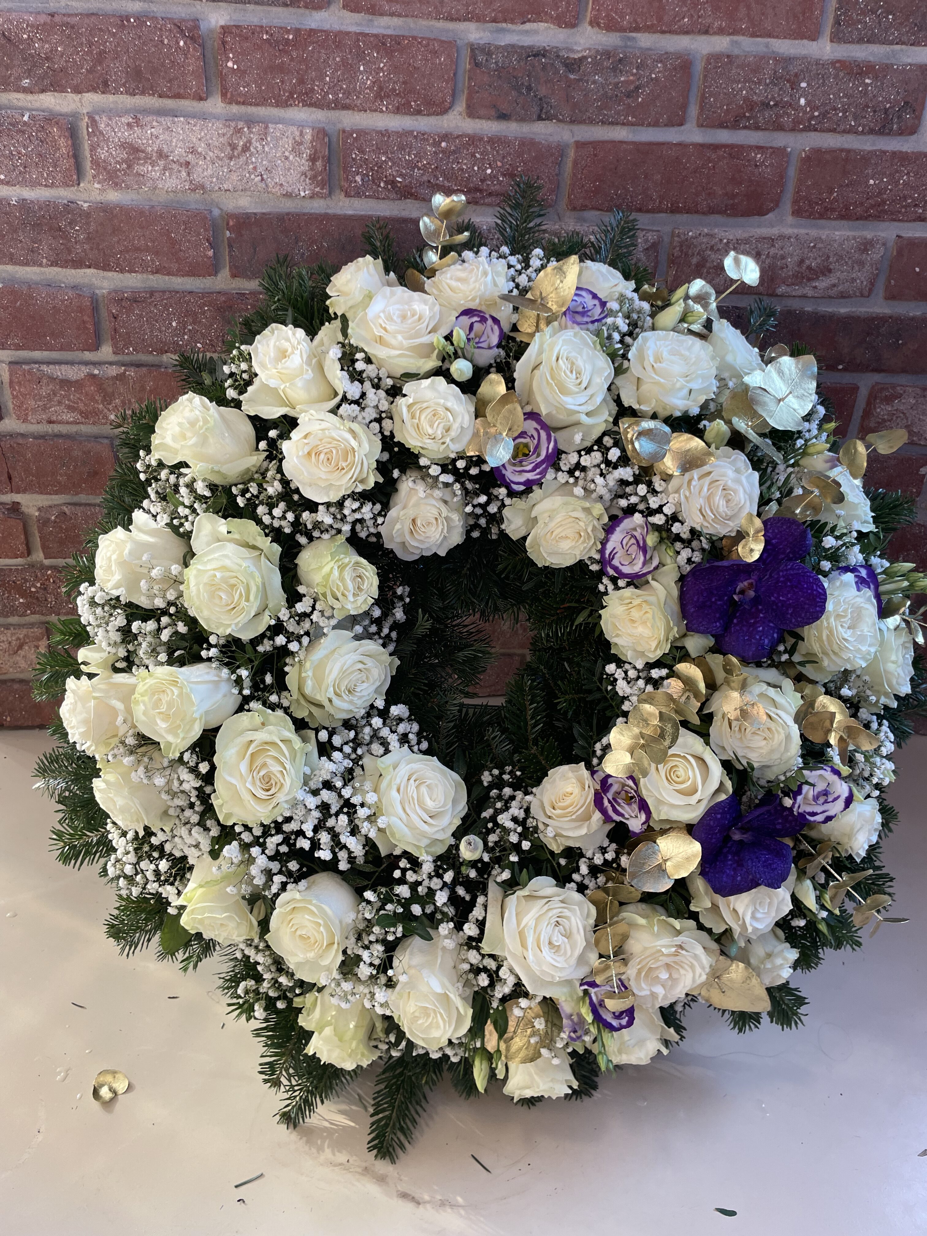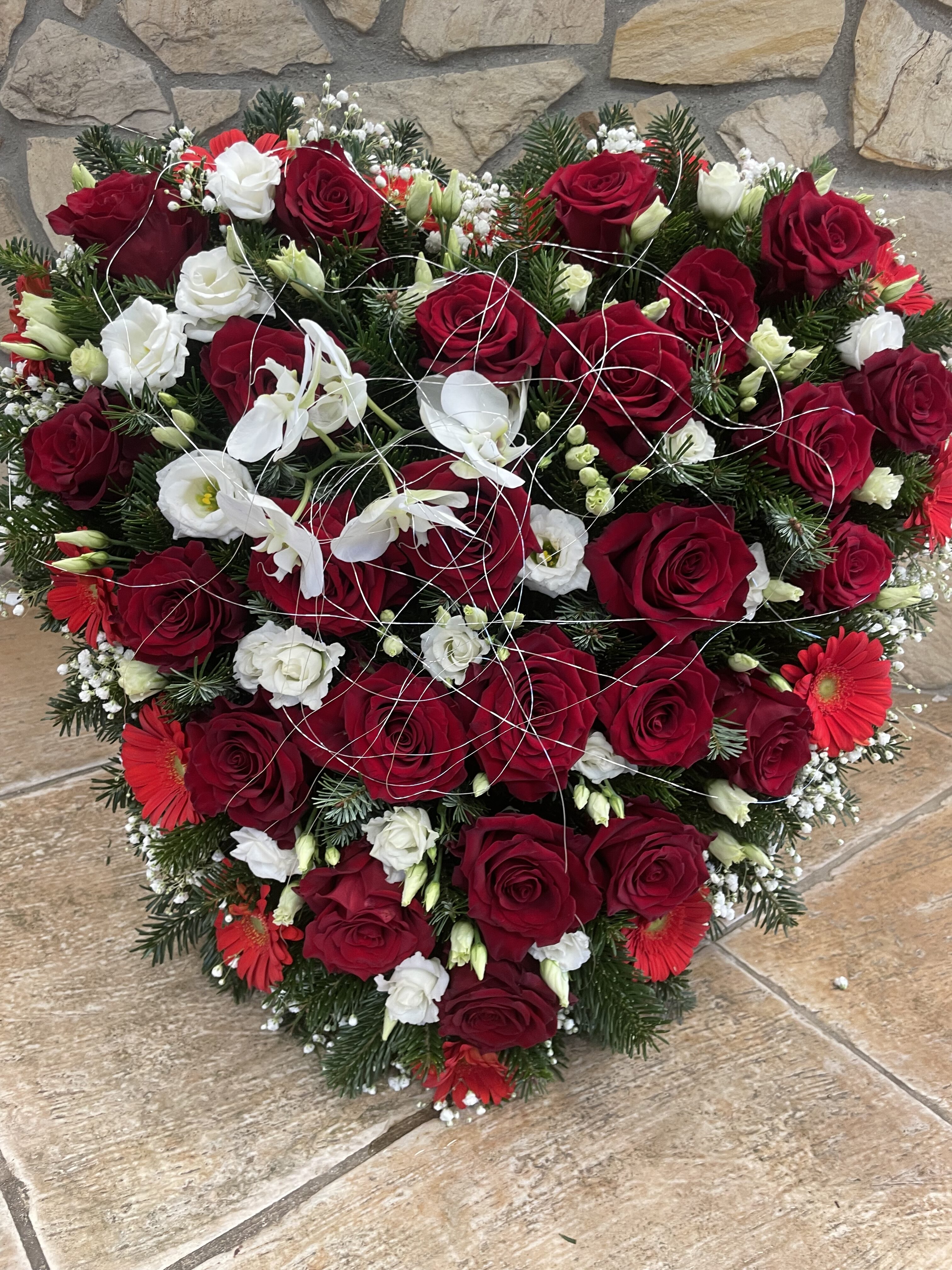 Naše vence sú starostlivo aranžované z čerstvých kvetov a zelene, aby vyjadrovali úprimnú sústrasť a dôstojnosť. Používame kvety s hlbokou symbolikou – biele ľalie na vyjadrenie pokoja a čistoty, ruže na znak lásky a úcty, chryzantémy na večnú spomienku. Každý veniec je navrhnutý s dôrazom na estetiku a pietu, aby dôstojne dopĺňal poslednú rozlúčku.