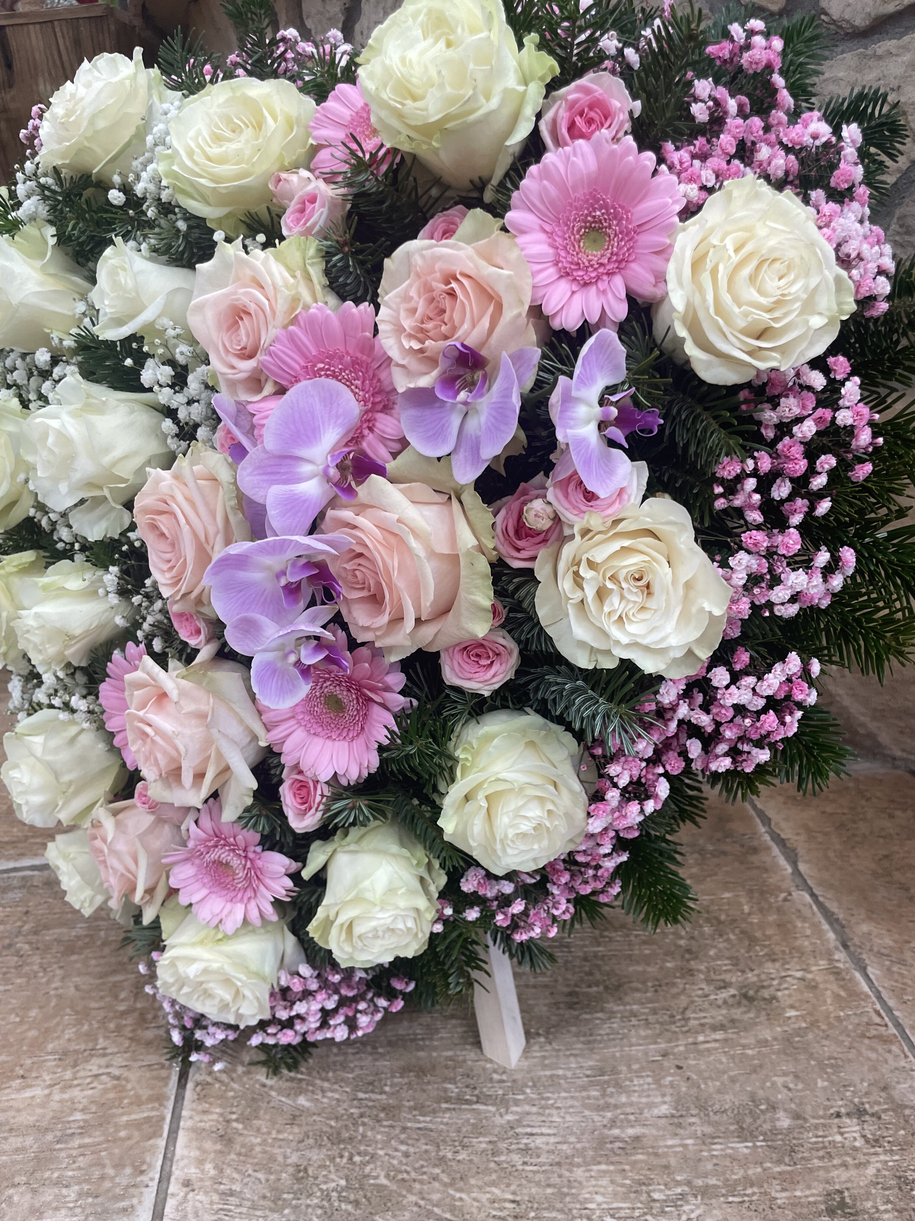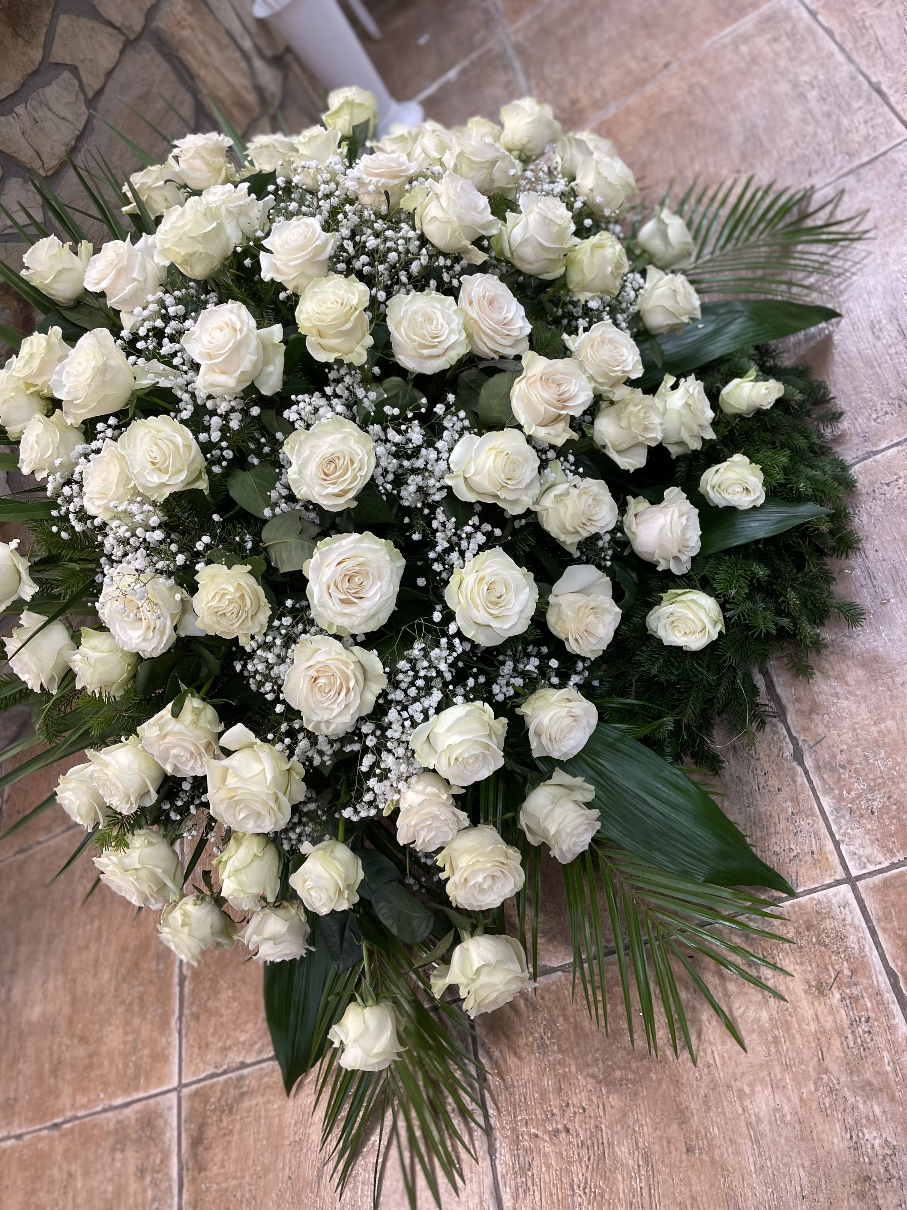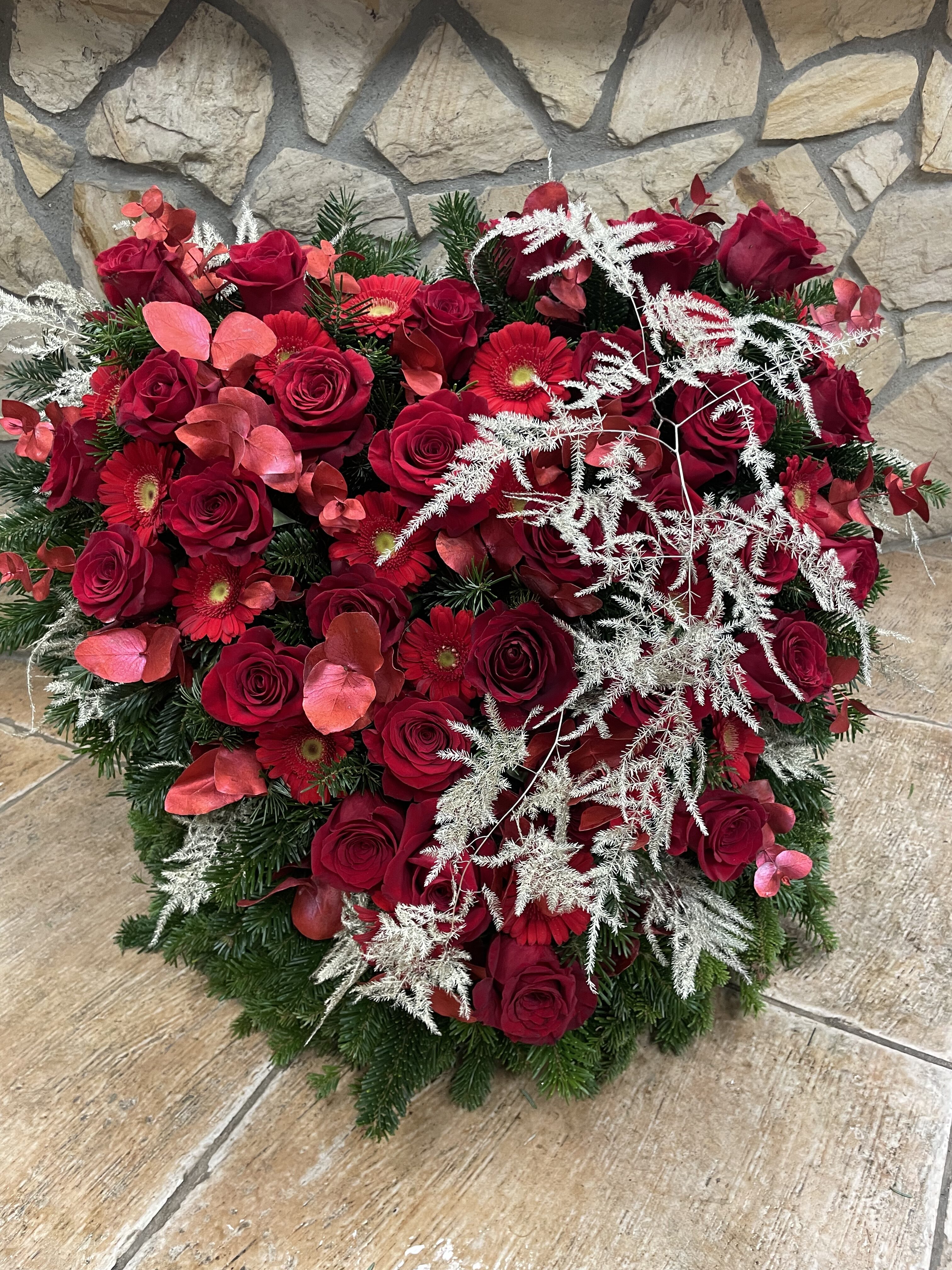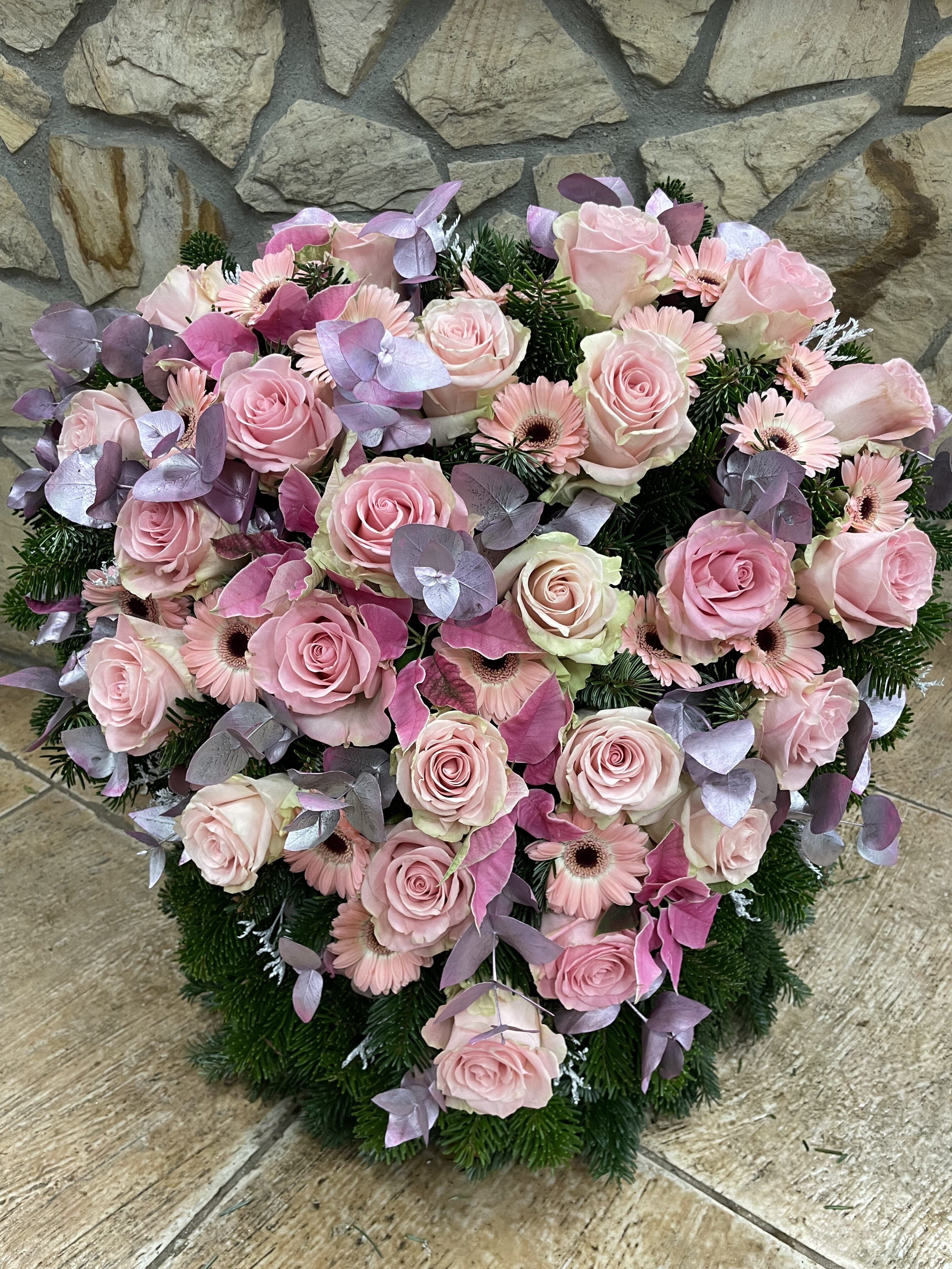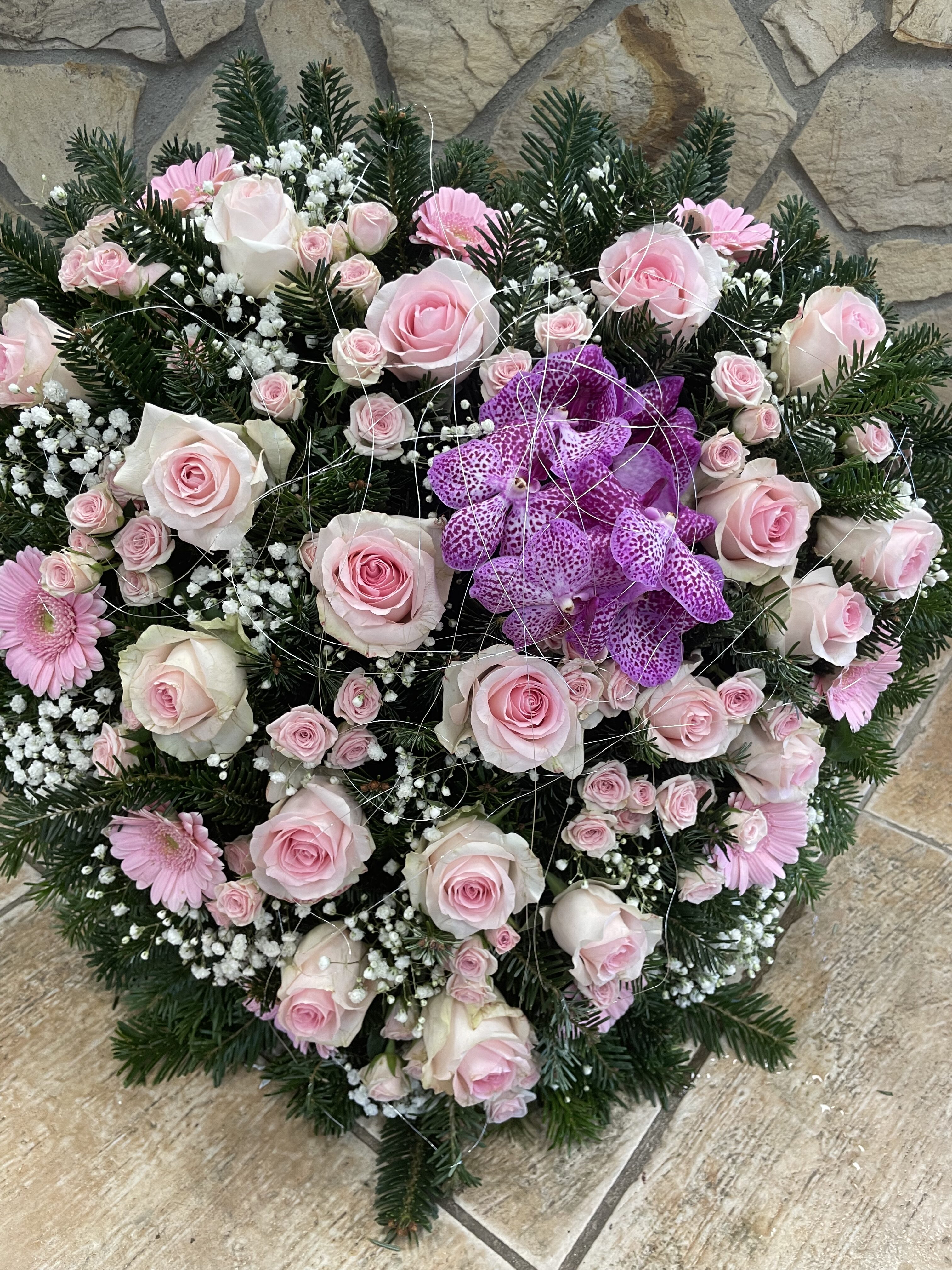 Naše vence sú starostlivo aranžované z čerstvých kvetov a zelene, aby vyjadrovali úprimnú sústrasť a dôstojnosť. Používame kvety s hlbokou symbolikou – biele ľalie na vyjadrenie pokoja a čistoty, ruže na znak lásky a úcty, chryzantémy na večnú spomienku. Každý veniec je navrhnutý s dôrazom na estetiku a pietu, aby dôstojne dopĺňal poslednú rozlúčku.
